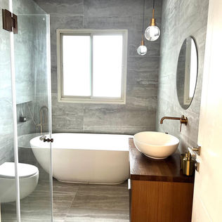 For this project in Even Yehuda, the client’s brief was simple: create 2 bathrooms that feel like a luxury five-star hotel. We transformed two outdated bathrooms into elegant, spa-like spaces featuring a beautiful freestanding bath, luxurious Italian tiles, and a drop-down ceiling with soft spot lighting to enhance the atmosphere. Rose-gold taps and fittings add warmth and glamour, resulting in a stunning, high-end bathroom retreat.
