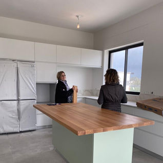 This kitchen was designed for a lovely retired couple, one Israeli and one British, who wanted a timeless, classic space to enjoy in their home. Challenging as we were in the midst of COVID. Mask time. This penthouse overlooked beautiful orchards of orange trees, which were visible through the kitchen window, so we chose green bar stools to reflect the colours of the landscape and bring the outdoors in. The result is a warm and elegant kitchen that connects naturally with its surroundings. A beautiful Granite porcelain worksurface elevated the look of the kitchen.