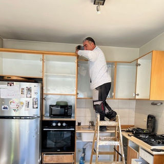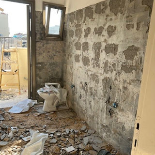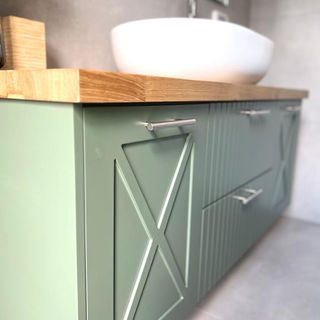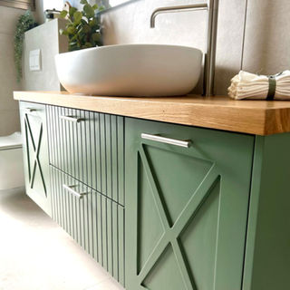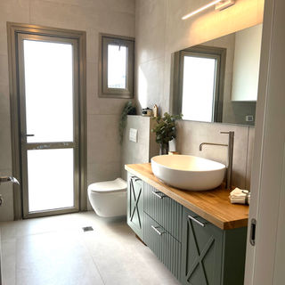 This full gut renovation in Tel Aviv included a bathroom renovation, renewal of their old kitchen & new floors. We transformed an outdated bathroom into a stunning modern shower room, combining olive green and oak—a perfect pairing of warmth and elegance. By removing the old bathtub and constructing a new partition wall, we created the ideal layout for a luxurious shower. Additionally, we optimized functionality by incorporating a dedicated space for a side-by-side washer and dryer. The kitchen cabinet doors were removed and repainted. A new kitchen work surface and backsplash were installed. To upgrade the kitchen and add an add-on unit, designed on SketchUp, completed the space.